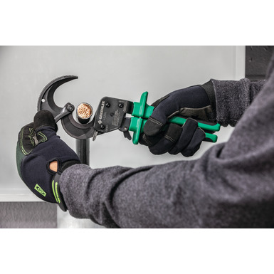 Los cortadores de cables cuentan con un exclusivo mecanismo de trinquete de dos velocidades que se ajusta para cortes livianos o pesados.