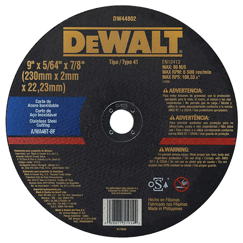 DISCO DE CORTE DE 9 X 5/64 DE ESPESOR, DW44802